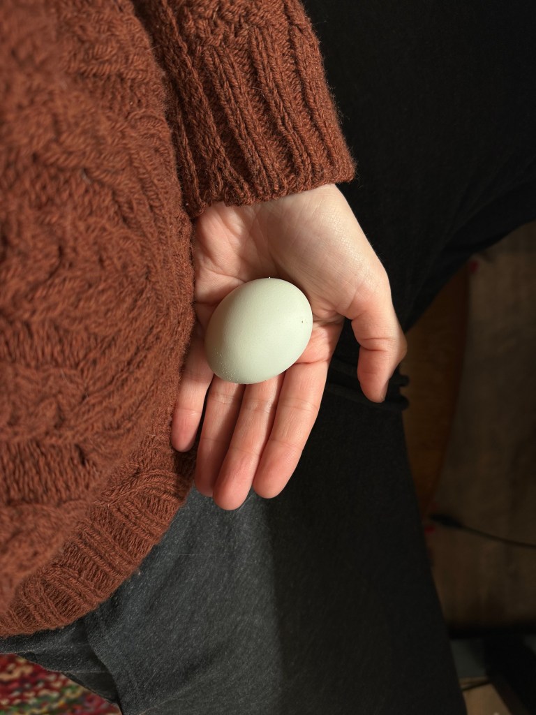 Since then, there has been a celebration every single time we collect an egg, and these days, we get three a day. Louisa was next to lay, and we waited with excitement to see her eggs (a light blue color). Finally, a solid month after the others, Charlotte started to lay. Hers are a darker green, and sometimes have gorgeous specking across them.