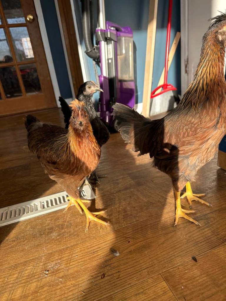 Our three remaining chickens, after one of several notable occasions where they broke out of their coop and pooped all over our floor.