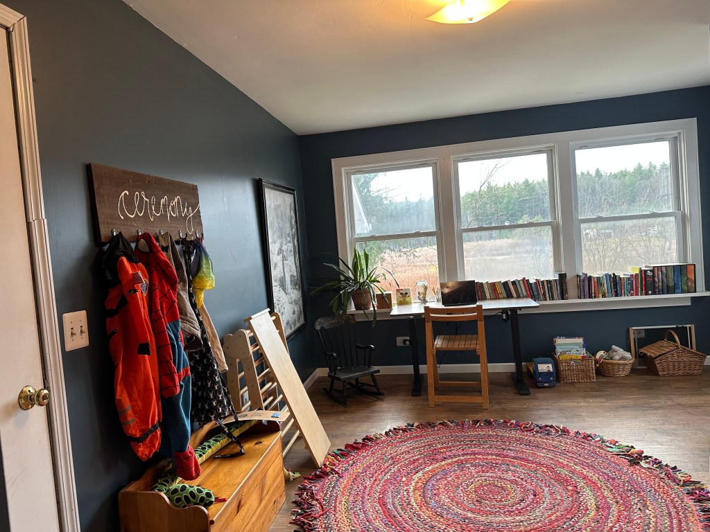 Simultaneously, I got to work reclaiming the room they’d decimated. I scrubbed down every inch of it multiple times by hand, mopped twice, and then got to work setting it up as a cute little office/playroom.