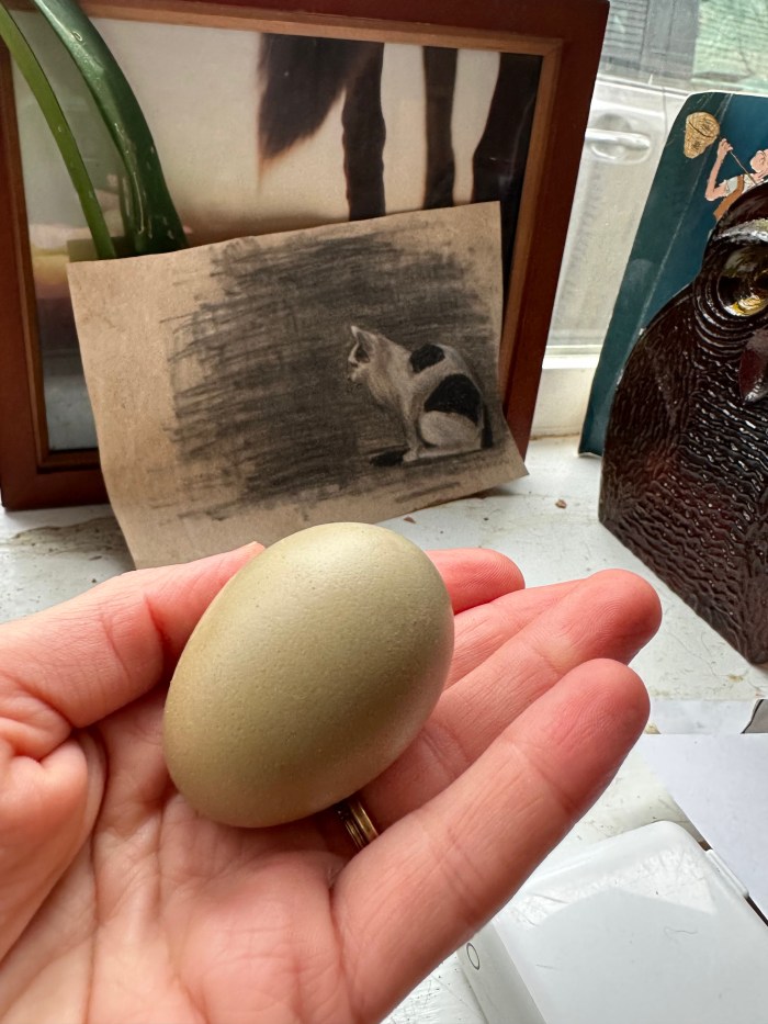 We knew it was coming because she flew over the top of the coop and then dropped down into the nest boxes that Jordan had yet to finish. But she couldn’t seem to find the right spot–for a couple of days she was very restless, escaping from her pen to roam the garage. And then at last: one day I went out after she’d been sitting in the next box. I almost missed it, the egg was so small and half-buried in the straw.
